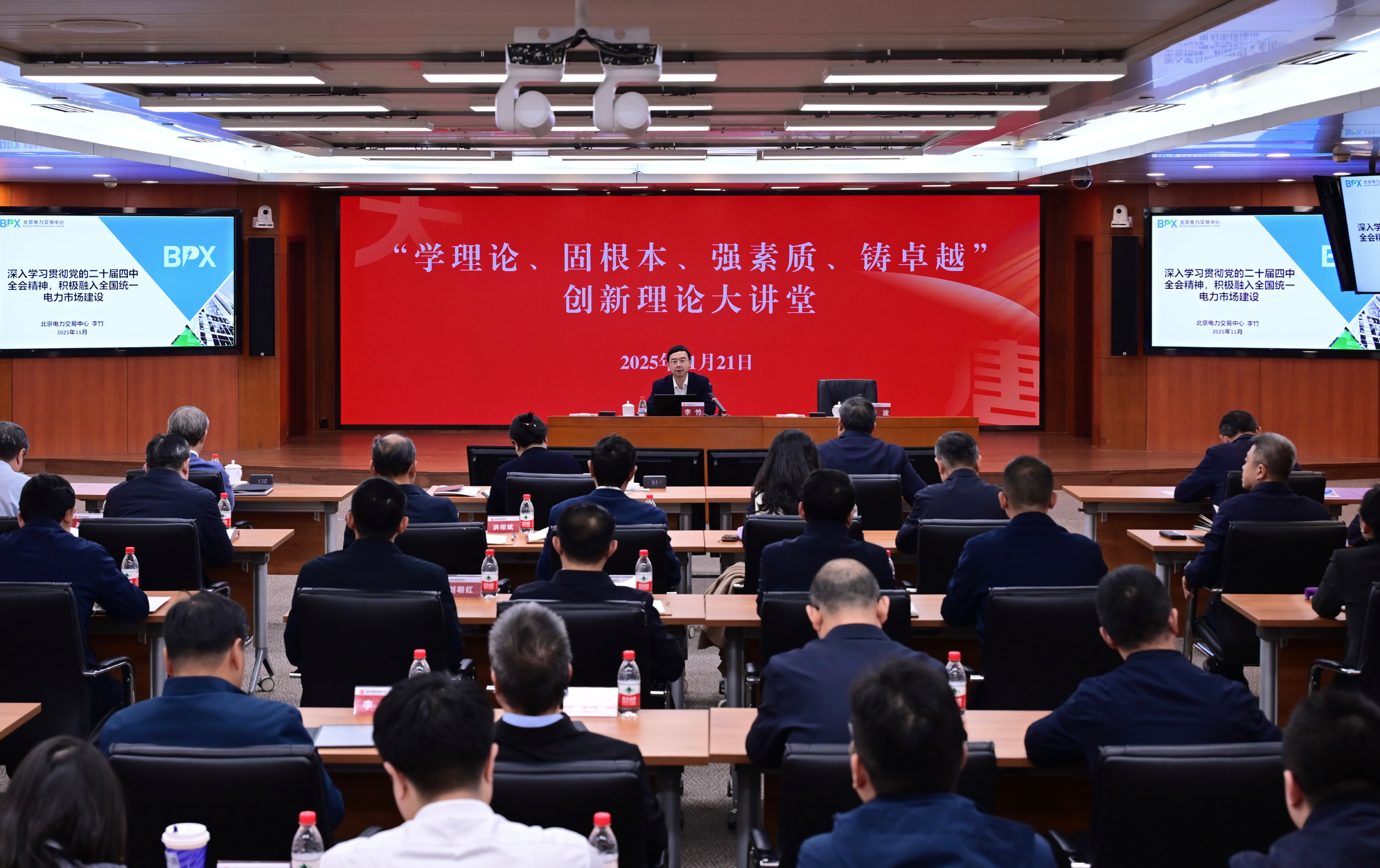 11月21日,中國大唐集團有限公司“學理論、固根本、強素質、鑄卓越”創新理論大講堂再度開講,邀請北京電力交易中心有限公司副總經理、能源行業電力市場技術標準委員會副主任委員李竹作《深入學習貫徹黨的二十屆四中全會精神,積極融入全國統一電力市場建設》專題講座。集團公司董事、黨組副書記余波主持講座,集團公司領導王瑛、曲波、陶云鵬、茍偉參加講座。