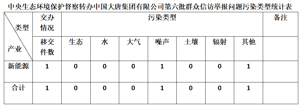 2025年6月9日,中央第七生態環境保護督察組向中國大唐集團有限公司移交第六批群眾信訪舉報件,共計1件,為來電舉報,涉及噪聲問題1個、其他問題1個。所有舉報件辦理工作已第一時間進入調查核實辦理程序,辦理情況將按照相關要求反饋督察組,并及時向社會公開。