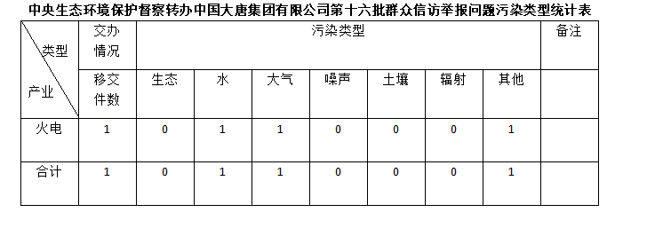 2025年6月22日,中央第七生態環境保護督察組向中國大唐集團有限公司移交第十六批群眾信訪舉報件,共計1件,為來電舉報1件,涉及水問題1個、大氣問題1個、其他問題1個。所有舉報件辦理工作已第一時間進入調查核實辦理程序,辦理情況將按照相關要求反饋督察組,并及時向社會公開。